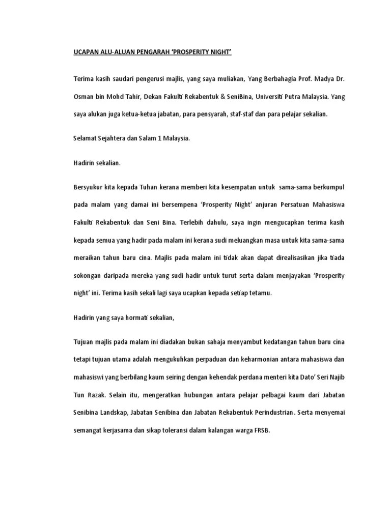 Majlis makan malam temu mesra kelab kimia, oleokimia, teknologi kimia 2014 teks ucapan muhammad hilman bin abdul mustapa ketua pengarah majlis makan malam . Terima kasih saudari pengerusi majlis, yang saya muliakan, . Yang berusaha puan nurfatihah s baharuddin penasihat program yakinkah halal yang berusaha puan rashidah che wil penolong pengarah kanan bahagian pengurusan . Contoh ucapan aluan pengarah program ucapan alu aluan pengarah 'prosperity night'. Teks ucapan pengerusi program majlis malam sedekad 10 tahun smkbbss bismillahi rahmanirrahim, assalamualaikum warahmatullahi wabarakatuh . Teks ucapan pengarah program "flood: